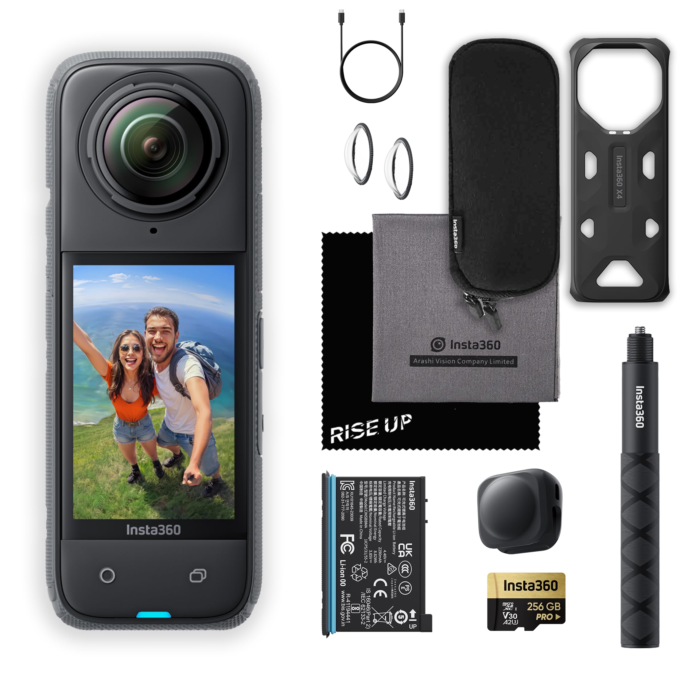 • IN THE BOX - 1x Insta360 X4, 1x Charge Cable, 1x Protective Pouch, 1x Thermo Grip Cover, 1x Lens Guards, 1x Lens Cloth, 1x User Guide, 1x 85 cm Invisible Selfie Stick, 1x Lens Cap, 1x 256 GB Micro SD card, and 1x RiseUP Lens cloth.